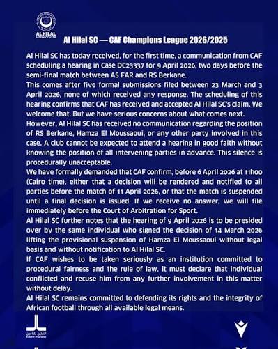 Al Hilal therefore demanded that CAF issue a final decision and notify all parties no later than 11:00 a.m. Cairo time on Monday, April 6, 2026. If no decision is made, the club requested that the CAF Champions League semi-final between RS Berkane and AS FAR scheduled for April 11 be suspended.