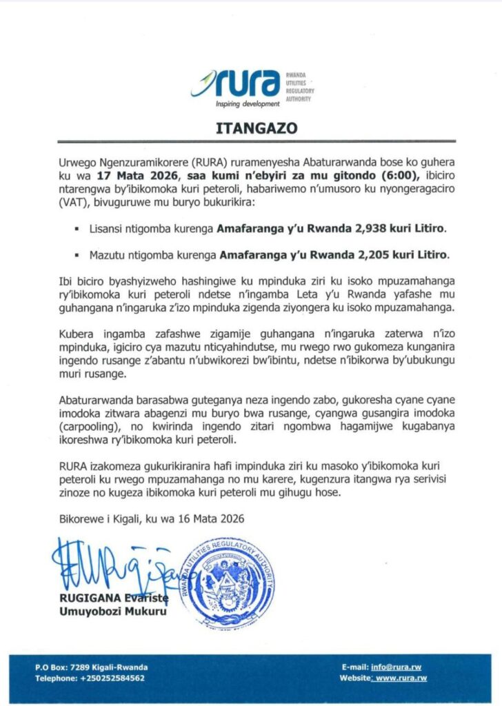The Rwanda Utilities Regulatory Authority (RURA) has announced new fuel prices, with petrol increasing significantly while diesel prices remain unchanged.