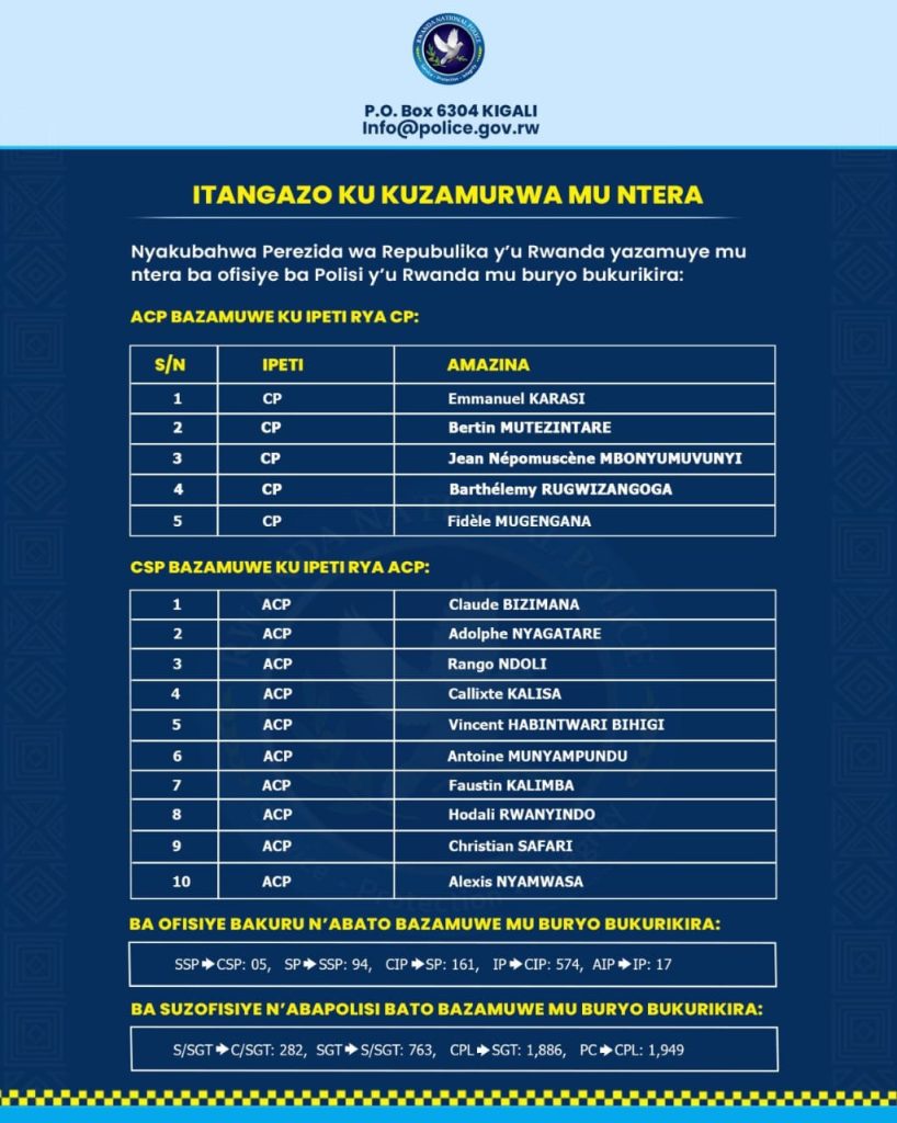 President of Rwanda Paul Kagame, has promoted several officers within the Rwanda National Police, including five officers elevated to the rank of Commissioner of Police (CP) and ten to Assistant Commissioner of Police (ACP).