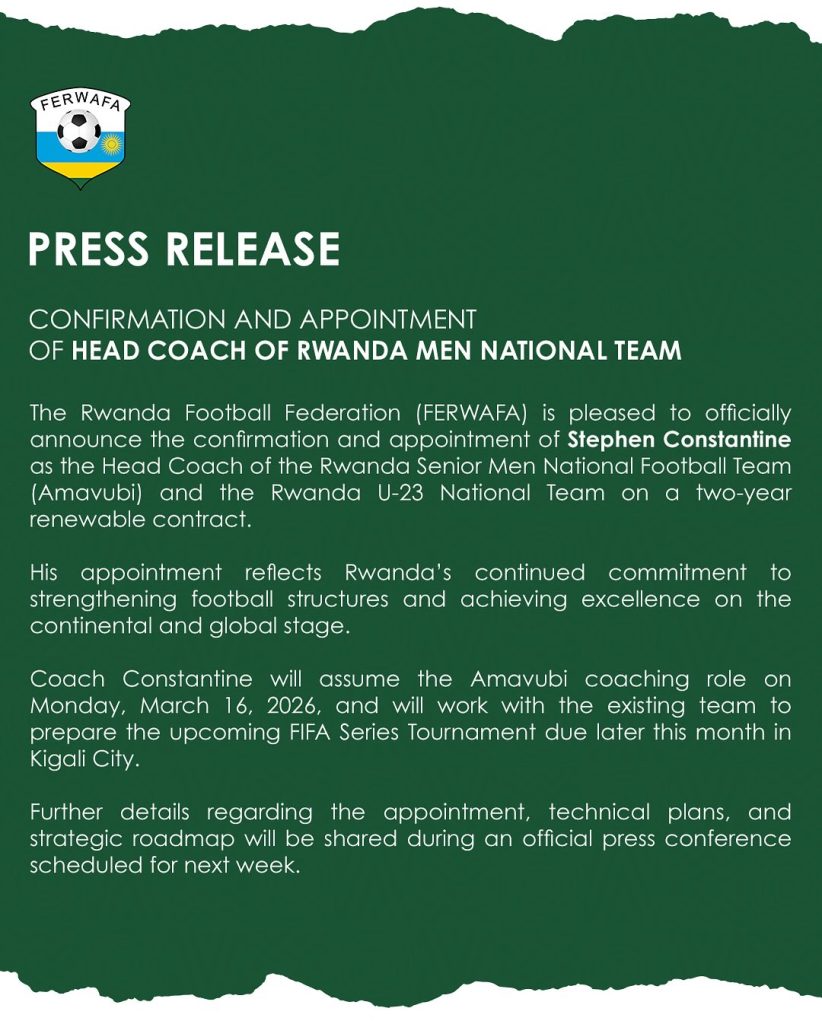 According to FERWAFA, Constantine is expected to officially take charge of Amavubi on Monday, March 16, 2026, where he will begin working with the existing technical staff and players. One of his immediate priorities will be preparing the team for the upcoming FIFA Series Tournament scheduled to take place later this month in Kigali.